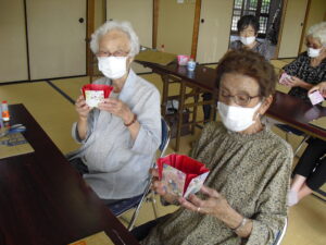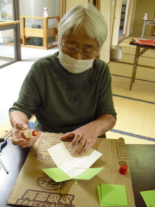 どなたも、素敵な作品になりましたね♪ 今回の創作は、午前、午後とめいっぱい使って行う予定でした。・・・が!みなさん流石!!一時間もあまして完成されました。 なので、その後は、脳トレと下肢運動を行いました。靴下を脱いで、歩行に必要な筋力を鍛える運動が、とても好評でしたので、次週も行いたいと思います。なかなか外を歩く事も難しい季節です。部屋の中でも行えるトレーニングで筋力を維持していきたいですね。 byK
