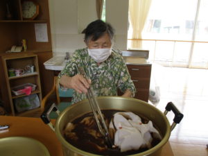 2020.07.24 デイサービスセンターぬく森 Tシャツ作り‼ 7月20日(月)にTシャツ作りを行いました。今回は、紅茶で色を染めました。優しい茶色になりました。 始めに、輪ゴム等を使用して模様を考えました。 染色をしました。 干して乾燥させます。 輪ゴム等を外してしわを伸ばせば完成です。(まだしわが残っているので洗濯をして完成) 皆様とても喜んでいただけました。 「デイサービスに来る時に着てくるわ」と言っていただける方もみえました。 大成功です! by tatsu