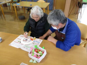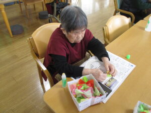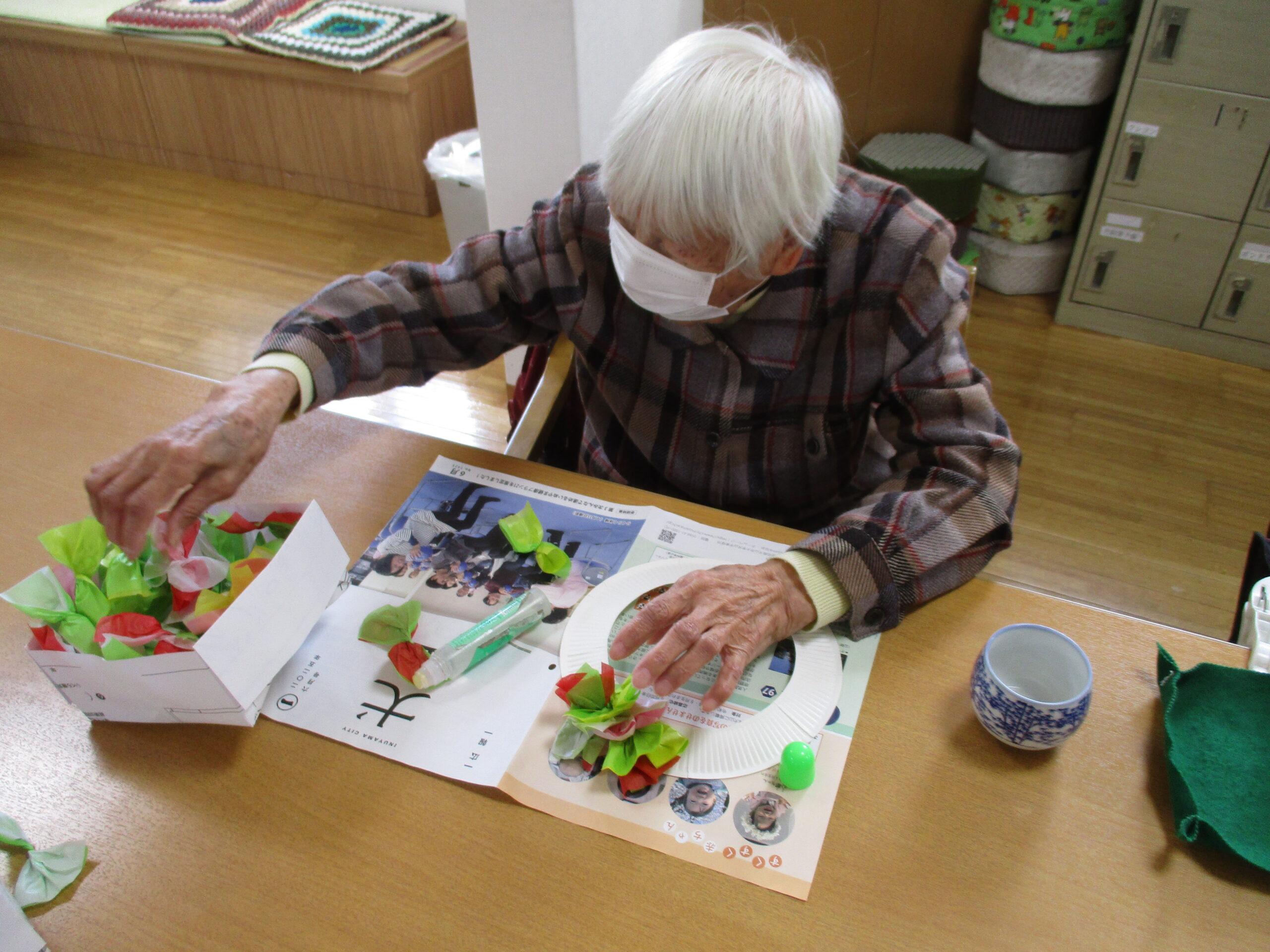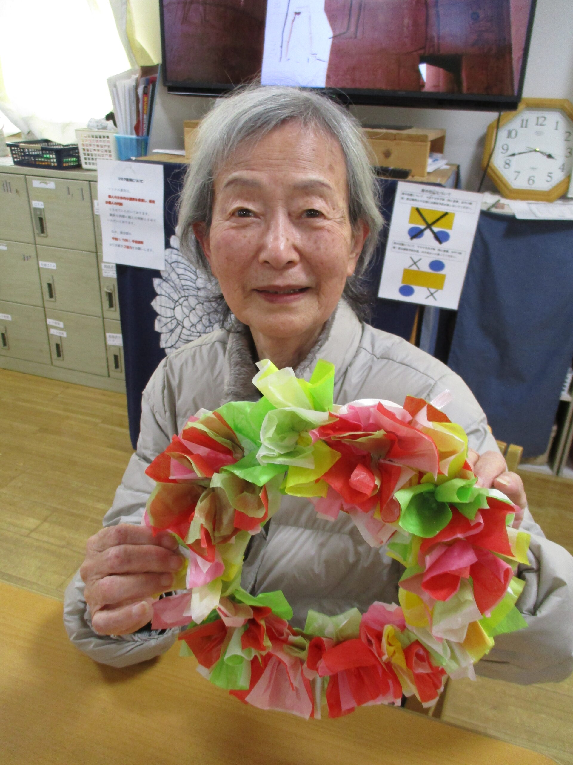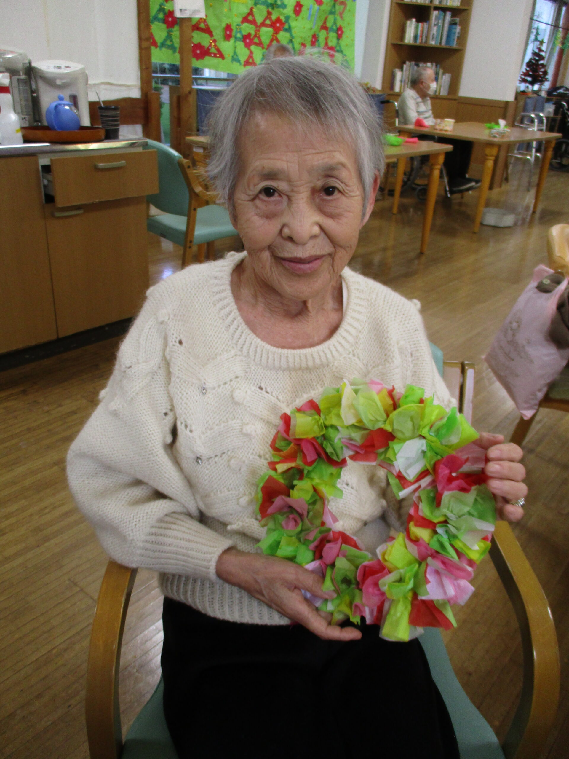 2025.12.10 デイサービスセンターぬく森 クリスマスリース作り! 12月5日にクリスマスリースを作りました。 色々な色を組み合わせて糊付けしていました。 飾りを土台に張り付けて完成です。 可愛いクリスマスリースが完成しました。 完成おめでとうございます。 とても良い作品が出来ました。 お家に飾っていただけると幸いです。 by tatsu