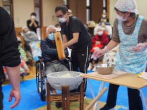 当日は、職員の精鋭だけではなく、入居者の方やご家族にも餅つきにご協力をいただき、