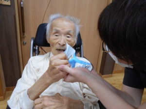 七夕飾りをご家族と一緒に作ったのち、おやつのプリンをみんなで食べるという。