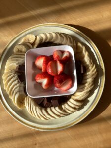 細かくしても、キレイな色ですね。チョコソースの甘い香りに誘われて、他ユニットの職員も見学に♪
