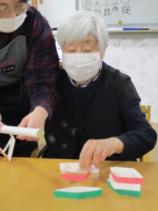 2026.03.04 デイサービスセンターぬく森 雛祭りイベント 開催! 3月2日~4日まで雛祭りイベントを開催しました。 雛段つくり競争を行いました。 決まった位置にお雛様たちを並べるゲームです。 お雛様の飾りをうちわで運ぶのも送りゲームを行いました。 菱餅を早く作る対抗戦を行いました。 菱餅3段を縦に早く並べた方が勝ちになります。 最後に雛飾りの前で写真を撮りました。 最後に皆様でおやつに和菓子を食べました。 おいしかったです。 今日は楽しい雛祭りでした。 by tatsu